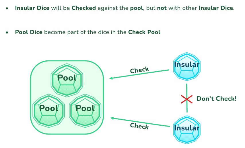 Insular Dice are a mechanic and symbol from the perspective of an individual’s effort. It is unable to interact with others’ efforts and is insulated from effectively collaborating in full.